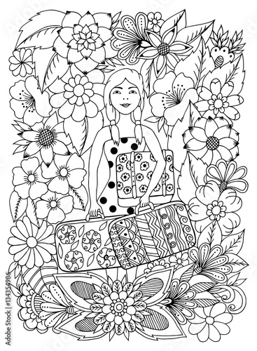 Vector Illustration Zentangl Girl With Suitcases Of In